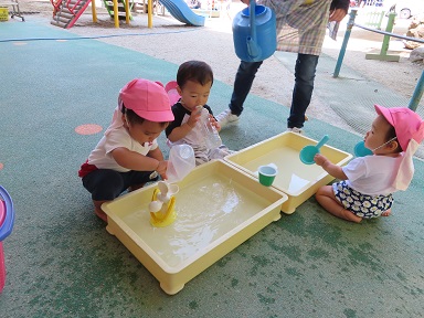 つくしさんは、0歳の新しいお友だちも一緒に、優しい水遊び。