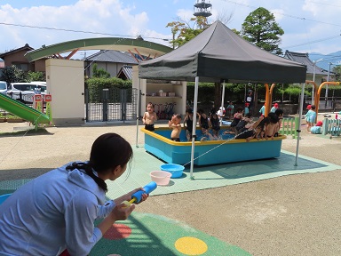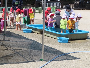 年少のもも組さんは、園庭のプールでバシャバシャ豪快に遊んでいました。先生が水鉄砲で水をかけてもへっちゃらです。