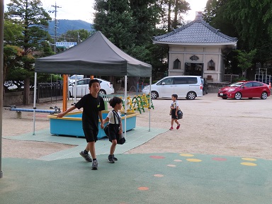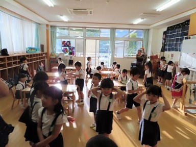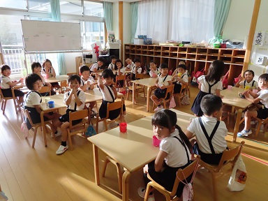 夕方5時40分。家族に付き添われ、年長さんが「こんばんは」と元気に再登園。皆、堂々として登園して来て「よろしくおねがいしま~す!」となかなかの挨拶をしてくれました。