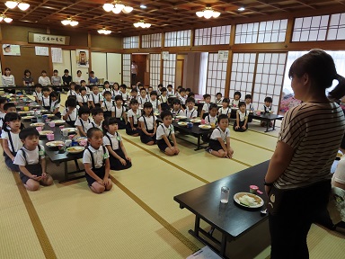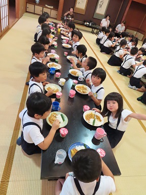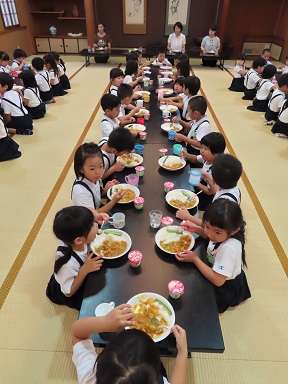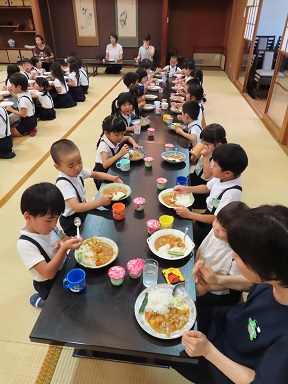 6時からは、お寺の広間で夕食です。今夜は給食の時とは違い、2クラス一緒に。そして先生達も皆一緒に美味しいカレーライスをいただきました。いつもは子供用の小さなカップですが、今日は大人と同じくらい大きなお皿にたっぷりのカレーをいただきました。夜、お腹が空いては困りますからね!