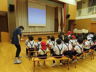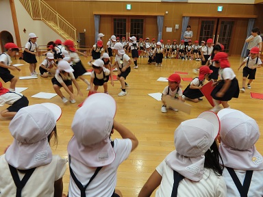 後半に行った「かえしてかえしてゲーム」は、クラスをAとBの2グループに分けて「もみじA 対 きくA」「もみじB 対 きくB」で、それぞれ2回戦行いました。はじめの2回はきく組の勝ち。ちょっともみじさんたち気落ちしてましたが、3回戦、4回戦は見事もみじが追い上げ、勝負は引き分け!丸く収まりました。すごい大騒ぎの勝負、大興奮でした。