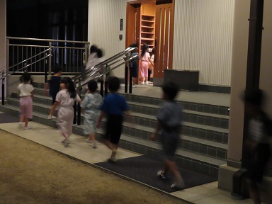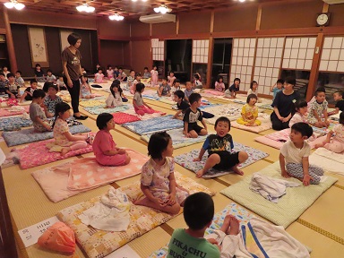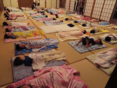 皆が遊んでいる間に、広間に先生達が布団を敷いて寝られる準備をしてくれていました。それでは、明日のスイカ割りを楽しみに「おやすみなさい」。