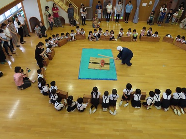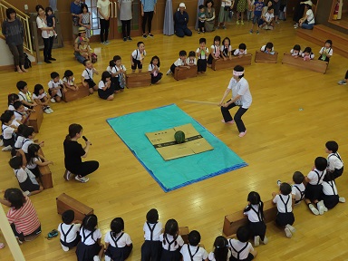 合宿の最後はスイカ割り。霧雨が降っていたため急遽遊戯室で行いました。園長先生のお話によると、この35年ほどの間、スイカ割りで雨が降ったのは初めてだそうです。職員にとっても貴重な体験となりました。スイカ割りはまず、担任が挑戦。でも割れず・・・。園長先生は命中しましたがヒビのみ。最後にPTA会長さんが見事に2つに割って見せてくれました。