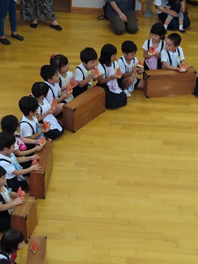 その後は、お迎えに来ていただいた保護者の方々と一緒にスイカをいただきました。