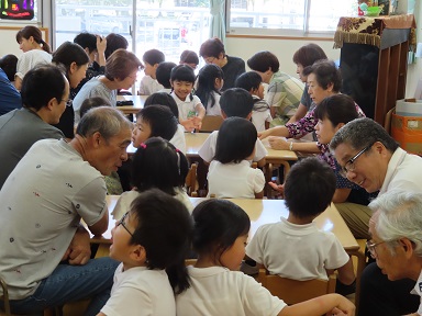 園長より「おじいさんおばあさんの持つ知恵を、是非お孫さん達と向き合う中でお伝えください。」との話がありました。どうぞ、お孫さんとの触れ合いを楽しみながら、子どもたちが知らないことを教えて賢い人となる手助けをしてあげてください。