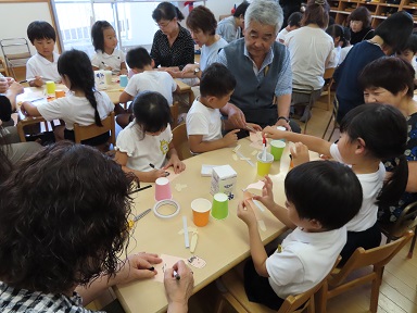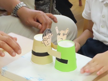 年長さんは、おじいちゃんおばあちゃんからお話を聞いたり、紙コップでお相撲さんをつくって一緒に遊んでいただきました。
