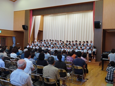 それぞれのクラスの参観の後には、遊戯室で園長講話をお聞きいただき、最後には、年長さんの歌のステージをお楽しみいただきました。『きくのはな』『とんぼのめがね』、そして、会場の皆さんとご一緒に歌う『ゆうやけこやけ』。遊戯室が暖かな歌声に包まれました。