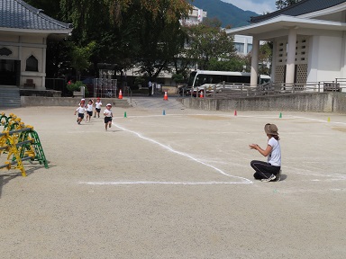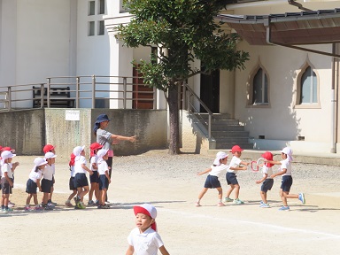子どもたちは、毎日学年毎で園庭を広々と使い、運動会に向けての活動を行っています。