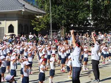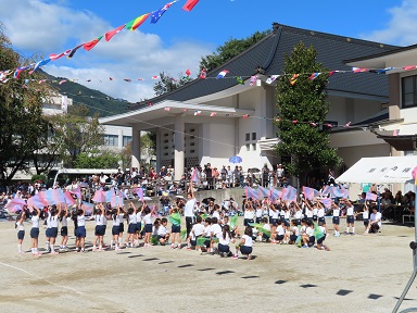 台風の置き土産の真っ青な空と強風の中、全身を使って生き生きと種目を行う子どもたちと、客席で大きな声を出して応援や拍手を送るご家族の皆さん、そして、種目の準備や片付けなどに奔走してくださったクラス委員の皆様のお力により、素晴らしい運動会を行うことができました。皆様大変ありがとうございました。また、テントから声援を送って下さったご来賓の皆さん、パン食い競争に来てくれた卒業生の皆さん、旗ひろいに来てくれたさくらんぼさん、大勢の皆さんのご参加、嬉しい限りでした。ありがとうございました。