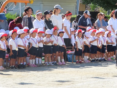 ごほうびの金メダルをもらって堂々と園歌を歌う年少さん。