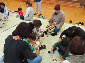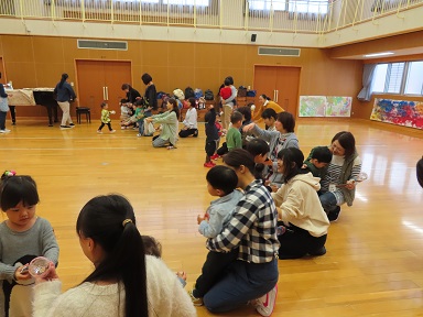 29日(火)・30日(水)とさくらんぼさんが集まりました。今回は【音の出るおもちゃをつくろう!】という活動を行いました。回数を重ねて園にくることが楽しみになってくれているようで、シール帳のシールを貼る場所をお家で確認してから来てくれるお友達も出てきました。嬉しいことです。今回は更にさくらんぼを楽しんでいただけるよう、お母さん達の交流ができるようにちょっと工夫してグループ作りをしてみました。出逢った親子同士がジャンケンで勝った方から自己紹介をして、相手に聞いてみたいことを質問し、お互いのことを知る機会に。相手を変えて行っていく内にお母さん同士のお話に花が咲き!いい雰囲気ができあがりました。さくらんぼさんたちも、お母さんに負けずに、自分で名前を紹介できましたね!