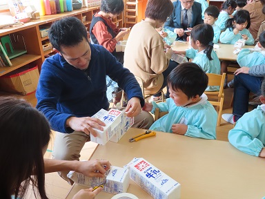 年中さんは、保育参加の形で行っていました。親子で牛乳パック2本を使って工夫して舟を作りました。お子さんの発想や指示に従って、お父さんお母さんがカッターを使って切り込みを入れて、オリジナルの素敵な舟ができあがりました。牛乳パック2本が、様々な舟に変身しました!↓