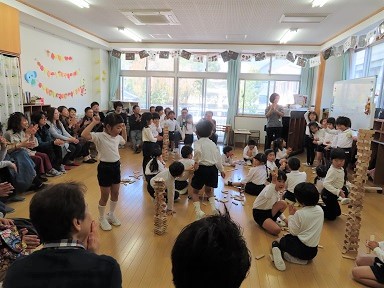 年長さんは、考えを出し合ったり、自分の思いに折り合いをつけたり、協力し合って1つのものを作る等、グループのお友達との遊びの姿を通して”協調性”の育ちを感じていただきました。グループ対抗の積木を高く積み上げる競争では、参観者の保護者の皆さんも大いに盛り上がっていましたよ!