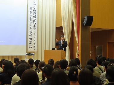 参観後にはPTA講演会が行われ、約100人の保護者の方や地域の方が参加されました。今回は松本市立菅野中学校長 松島恒志先生にお越し頂き『メディア機器に頼らない子育て~親子のふれあいを大切に~』という演題でお話をしていただきました。ブルーライトの視力や体への影響、現代の子どもとメディアの関係性や、子どもたちが健康に心豊かに育っていくために親はどのようなふれあいをすれば良いのか等々、「ドキッっとして・ハッっとして・そして納得した」そんな大変ためになる講演でした。