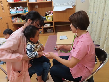 午後には、今年2回目の内科検診がありました。0,1歳児のクラスでは先生の聴診器を見て泣き出すお友達もいましたが、流石に以上児さんたちは泣かずに見てもらえました。冬が近づき、乾燥肌で背中やお腹にかき傷のあるお友達が気になりました。保湿剤をたっぷり塗ってあげてくださいね。”たっぷり”は、ティッシュペーパーを付けて落ちない程度だそうです。