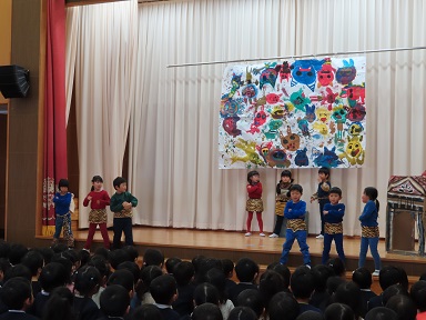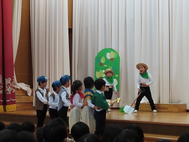 劇とリズムの会では、年中さんはクラス毎に歌と合奏を、年少さんは学年で手遊び歌を、年長さんはクラス毎に劇を発表します。