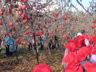 下伊那郡松川町の今村農園さんのご厚意で、毎年年長児をりんご狩りにお招きいただいております。今年は11月下旬にお邪魔する予定でしたが、雨で延期に延期となり今日の午後行かせていただきました。