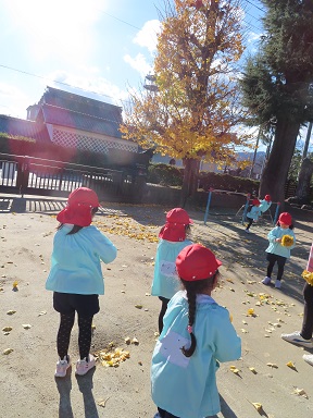 園庭の木々も冬支度。銀杏の葉が、例年より2週遅れで散りはじめました。環境に自然に加わった綺麗な黄色の銀杏の葉。子どもたちは早速手に取り遊びに取り入れ始めています。黄色の葉束、お家に持って帰って誰にプレゼントするのかな!?