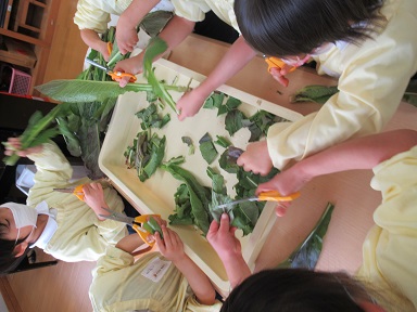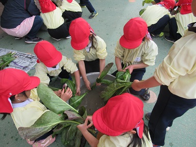 10月下旬に蒔いた源助かぶ菜の種が収穫の時を迎え、11日に年長さんがバスで女子高の畑に行き、収穫作業をしてきました。収穫してきたかぶ菜は早速園に持ち帰ってきれいに洗いました。一般的な丈に比べるとちょっと小柄ですが、年長さんが洗うには丁度よい大きさだったようです。一晩水を切って、12日には漬け込み作業。