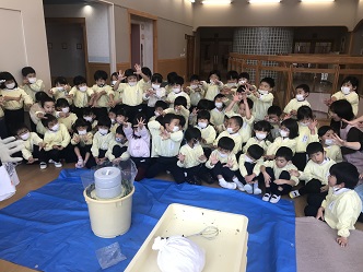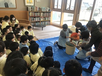 最後に「おいしくな~れ」と皆でおまじないをかけて・・・。20日のお餅つきには3色お餅と一緒においしく漬かったかぶ菜をいただけることでしょう。楽しみですね!