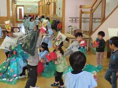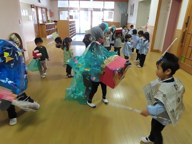 年末から年少さんで楽しんでいた獅子舞。お正月があけたらバージョンアップです!