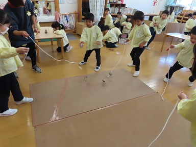年長の保育室ではこま回しが始まっています。紐を巻いて回す”投げごま”です。PTAよりお正月のお年玉として年末に頂き、お休み中にお家で色を塗ったり、回す練習をしてきたようです。