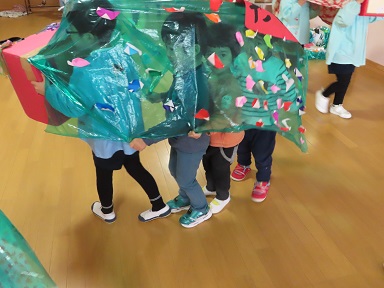 「入っていいよ!」年少さんが幌の中にちゅーりっぷさんを入れてあげて、一緒に練り歩く姿もありました。