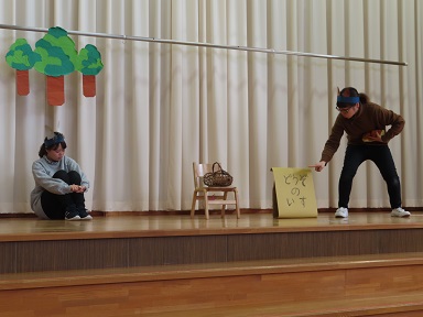 ロバさんが寝ている間にどんぐりがいろいろな物に交換され、最終的に栗になっていた・・・、というお話。絵本で親しんでいるお話だけあって、含み笑いをしながら嬉しそうに見ている子どもたちでした。