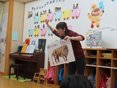 お誕生日のお祝いに、つくしさんの先生が楽しいお遊びをしてくれましたよ!『ばすにのって』の”サバンナ”バージョン!イノシシ・わし・チーター・ライオンが出てきて、大喜びで一緒に楽しみました。