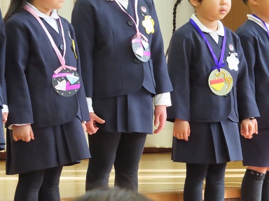各担任の先生が作ってプレゼントしてくれたペンダントは・・・今回は”こま”。アトラクションでは、年少の先生達が『どうぞのいす』の劇を見せてくれました。
