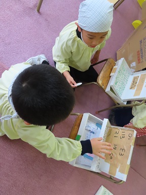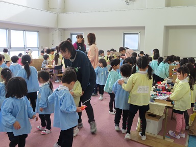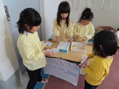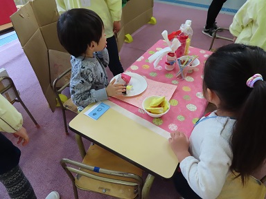 最近では、お店屋遊び場ができあがって行くにつれ「お客さん呼びたいね!」という声があがり、年中さんや年少さん、そして未満児さんたちも呼びに行き、『スペシャルランド』は更に活気づいて、楽しい遊びの場になっています。