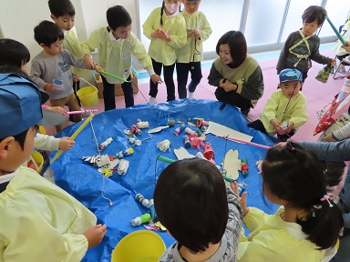 年末から、年長2クラスで行われていた遊びをプール室に持ち込み、2クラス合同で遊び始めました。