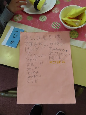 これはレストランの様子。メニューも自分たちで書いたようです。2歳児さん達が自分の好きなものを注文していました。