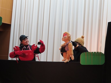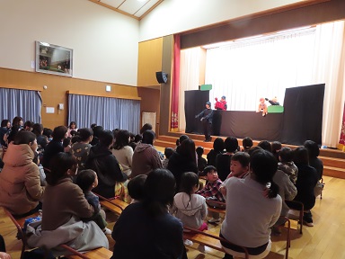 今回はPTAのお母さんたちの人形劇団『きらきら座』による『さるかに』の上演をみんなで楽しみました。