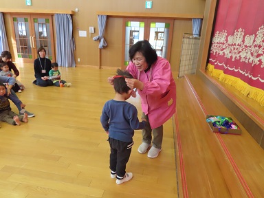『さるかに』のお話よく知っているお話のようで、とっても興味を持って集中してみていました。園の未満児さんたちも一緒に見せてもらったので、大勢のお客さんでした。