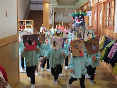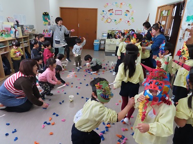 2才児さんのお部屋には、こわ~い顔の鬼達が出現!お花紙でつくった豆を、元気に投げつけ鬼を追い出していました。