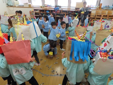 年少さんは新聞紙を丸めた豆を。鬼さんたち、本物の豆でなくてよかったですね。