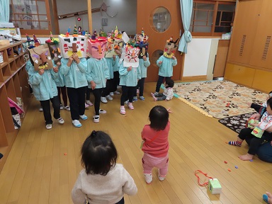 0才児さんのお部屋にも鬼がわんさかやってきましたが・・・、色とりどりの仮面に、怖さよりもむしろ面白さを感じたようで、ニコニコ嬉しそうにしているお友達がいました。