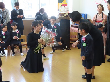 園隣の桜並木の桜も、このところの暖かさで一輪二輪と咲きほころんできています。昨日は年長さんの卒業式でした。新型コロナウイルス感染防止対策で、在園児は同席せず、卒業生、保護者、職員だけで式を行いました。卒業生となった年長さんは、先日年中さんと年少さんからもらった素敵なコサージュを胸につけ、阿弥陀様の前で立派に卒業証書を受け取ることができました。