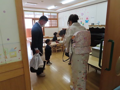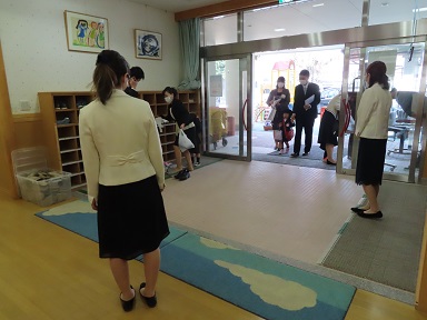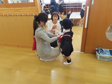 初めて制服を着て、制帽と通園カバンも身につけて、ちょっとドキドキしながらお父さんやお母さんに連れられて登園して来たお友達。今日は泣いているお友達はいませんでしたね!すごいですね~。