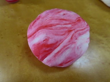 だんだん混ぜていくと、ほら、マーブル。惑星のようです。しっかり混ざるときれいなピンクになりました~。白の粘土とピンクの粘土をつかったら・・・素敵なケーキができましたよ!親子でいろいろつくって楽しんでくださいね。