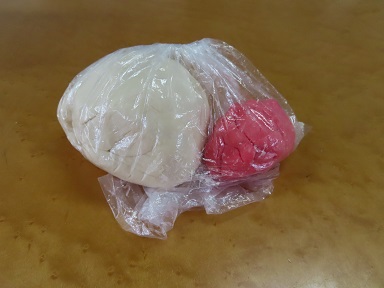 ④材料が一塊になって、ビニールからきれいに剥がれるようになったら・・・ビニールから出して机の上でこねこねしてよく混ぜ合わせればできあがり!