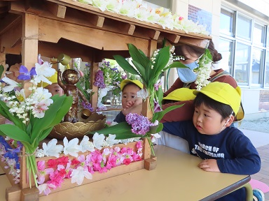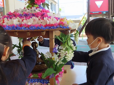 集会は行えませんでしたが、三密にならないよう玄関ポーチにお花御堂を飾って、クラスごとで小さなおしゃかさまに甘茶をかけてお祝いしました。