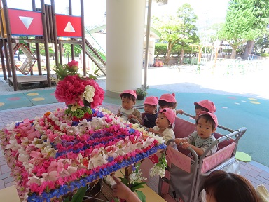 園で一番小さなつくしさんたちは、散歩車の中から。「あ」「あ」とお花御堂を一生懸命指さして見ていました。「きれいなおはながいっぱいだよ!」と言いたげに・・・。