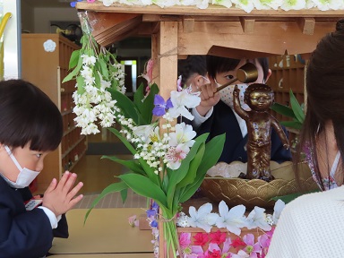 はなまつりがはじめての年少さんも、ゆっくり優しく灌仏をして、お手々を合わせていました。今回は集会ができませんでしたので、お部屋でおまいりをして先生からお釈迦様のお誕生の話を聞いたりしました。