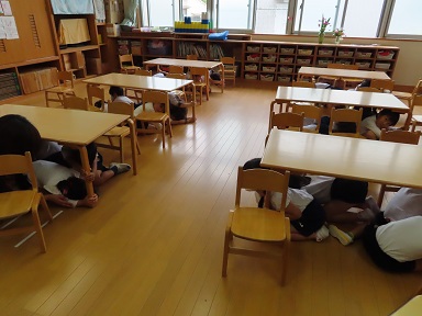 地震の訓練の放送を聞くと、すぐに机の下に潜り、ダンゴムシのポーズになりじっと待機。