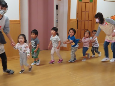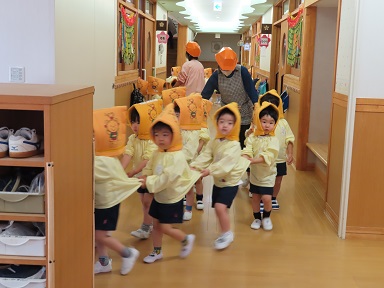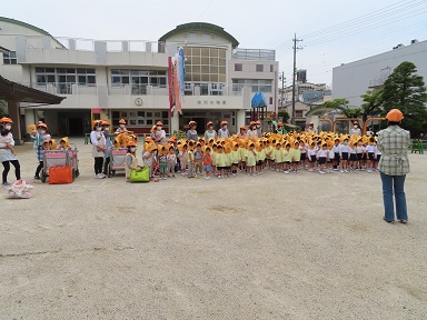 「地震」と聞いてちょっとドキドキ不安を感じたお友達もいたようですが、小さな1歳児さん以外は泣かずに訓練に取り組めました。2歳児さんも、年少さんも、安全に先生やお友達と無事に避難場所の園庭まで避難できました。