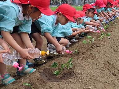 1人3~4本位苗を植え、自分で運んできたペットボトル入りの水や、牛乳パックを使って「大きくな~れ」と心を込めて水やりをしました。