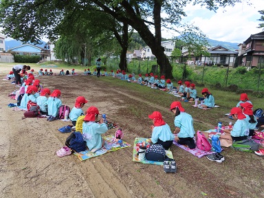苗植えの後は、園庭の4倍程ある広~い女子校のグラウンドをお借りして、お待ちかねの”おべんとうタイム!” みんなで協力して苗植えができたので、2クラス一緒に大きな○をつくってお弁当をいただきました。お家の方には、朝早くからお弁当のご用意をしていただきありがとうございました。みんな嬉しそうに食べていましたよ!
