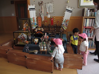 2階に行ったついでに座敷のぼりも見ました。怖いお顔のお人形が並んでいるのを見て泣き出すお友達もいたようです・・・。強く逞しくな~あれ!